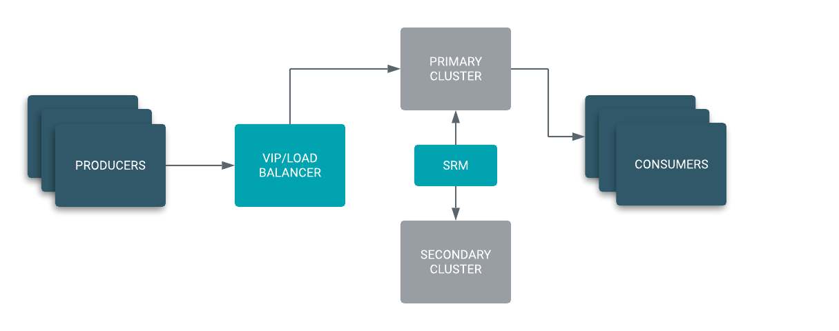 In an Active / Stand-by scenario, you set up two Kafka clusters and configure SRM to replicate topics bi-directionally between both clusters. A VIP or load balancer directs your producers to ingest messages into the active cluster from which consumer groups are reading from.