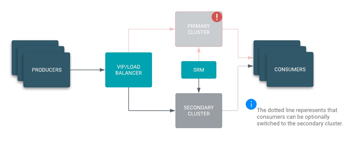 In case of a disaster, the VIP or load balancer directs the producers to the stand-by cluster. You can easily migrate your consumer groups to start reading from the stand-by cluster or simply wait until the primary cluster is restored if the resulting consumer lag is acceptable for your use case.