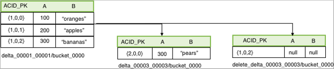 For every write operation, Hive creates a delta directory to which the transaction manager writes data files. Hive writes all data to delta files, designated by write IDs, and mapped to a transaction ID that represents an atomic operation. If a failure occurs, the transaction is marked aborted, but it is atomic: