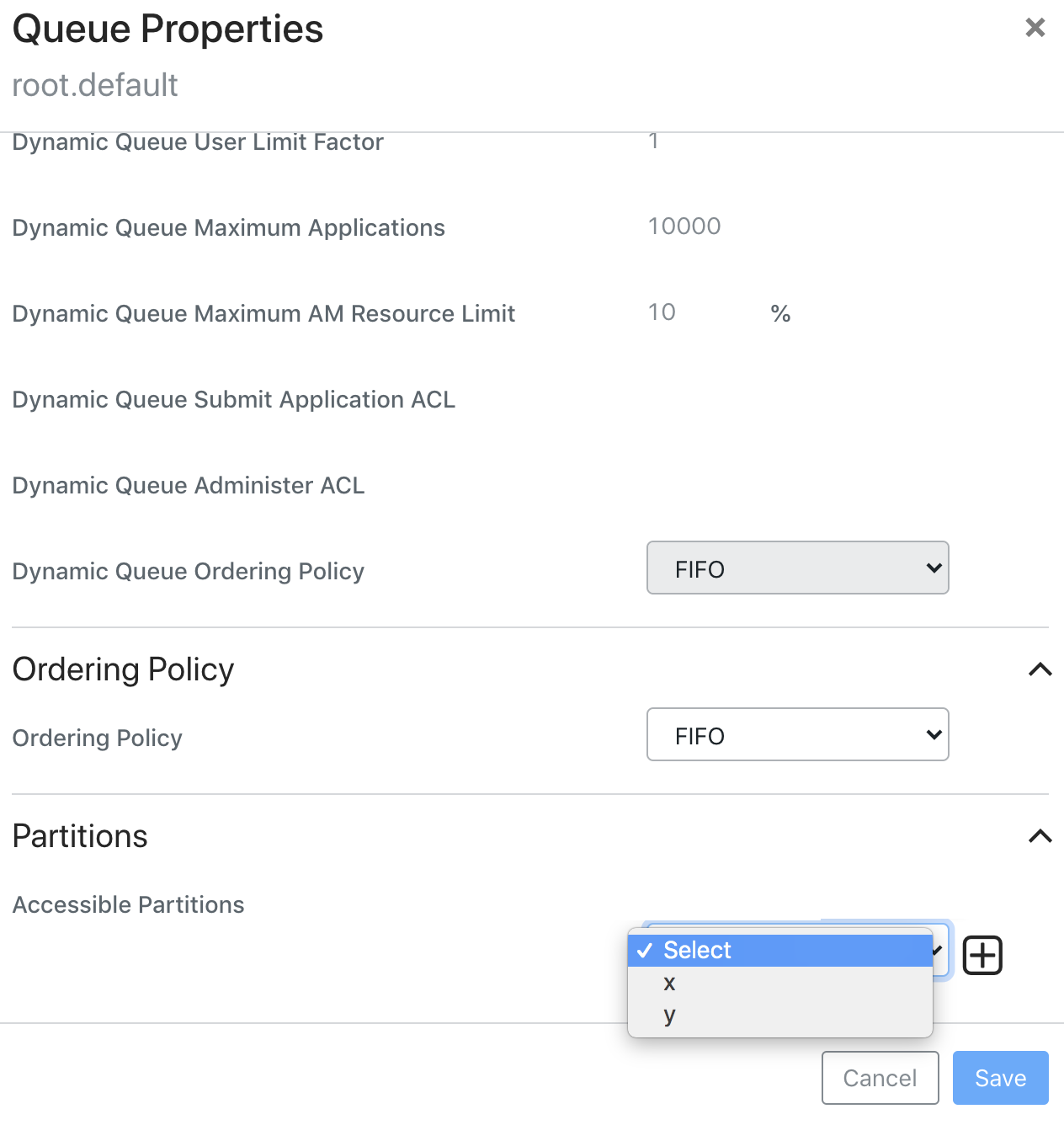 Use Queue Manager to create and assign partitions to cluster nodes, associate the partitions (yarn.scheduler.capacity.<queue-path>.accessible-node-labels) to queues and configure capacity to that queue for the specified partition. Queue Manager evenly distributes the available capacity among all the queues in the partition. You can manually modify the capacity on each partition of each queue, and also ensure that the sum of capacities of each partition of direct children of a parent queue at every level is equal to 100%. partitions that a queue can access (accessible partitions of a queue) must be the same as, or a subset of, the accessible partitions of its parent queue.