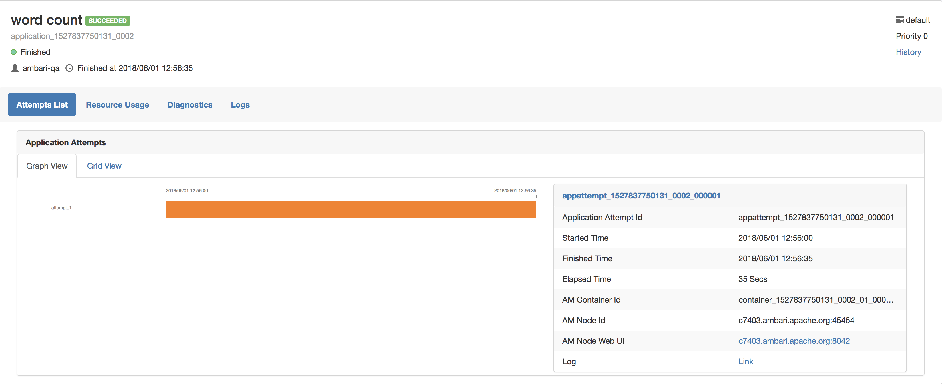 Use this tab to view the diagnostics details of the application attempts. You can view any outstanding resource requests, and scheduling information.