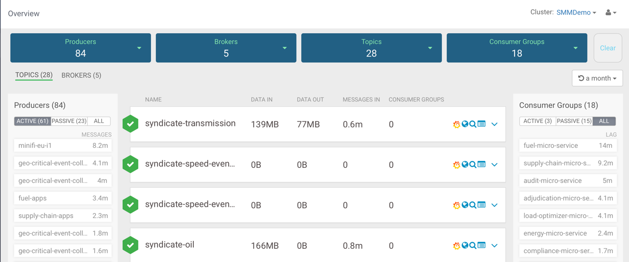 The Overview page gives you summary information about Consumer Groups on the right side of the page. You can use the Active, Passive, and All tabs to view Consumer Groups only in the Active or Passives, or all of the Consumer Groups. Use the Lag tab to sort consumer groups based on ascending or descending amounts of lag.
