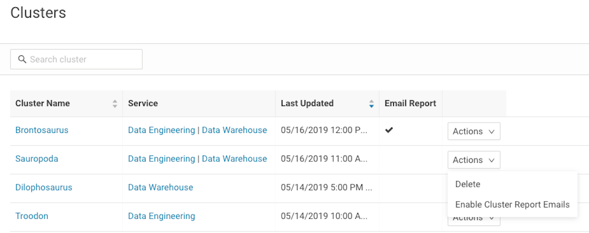 By default, the Clusters page displays your clusters by the date that they were last updated.