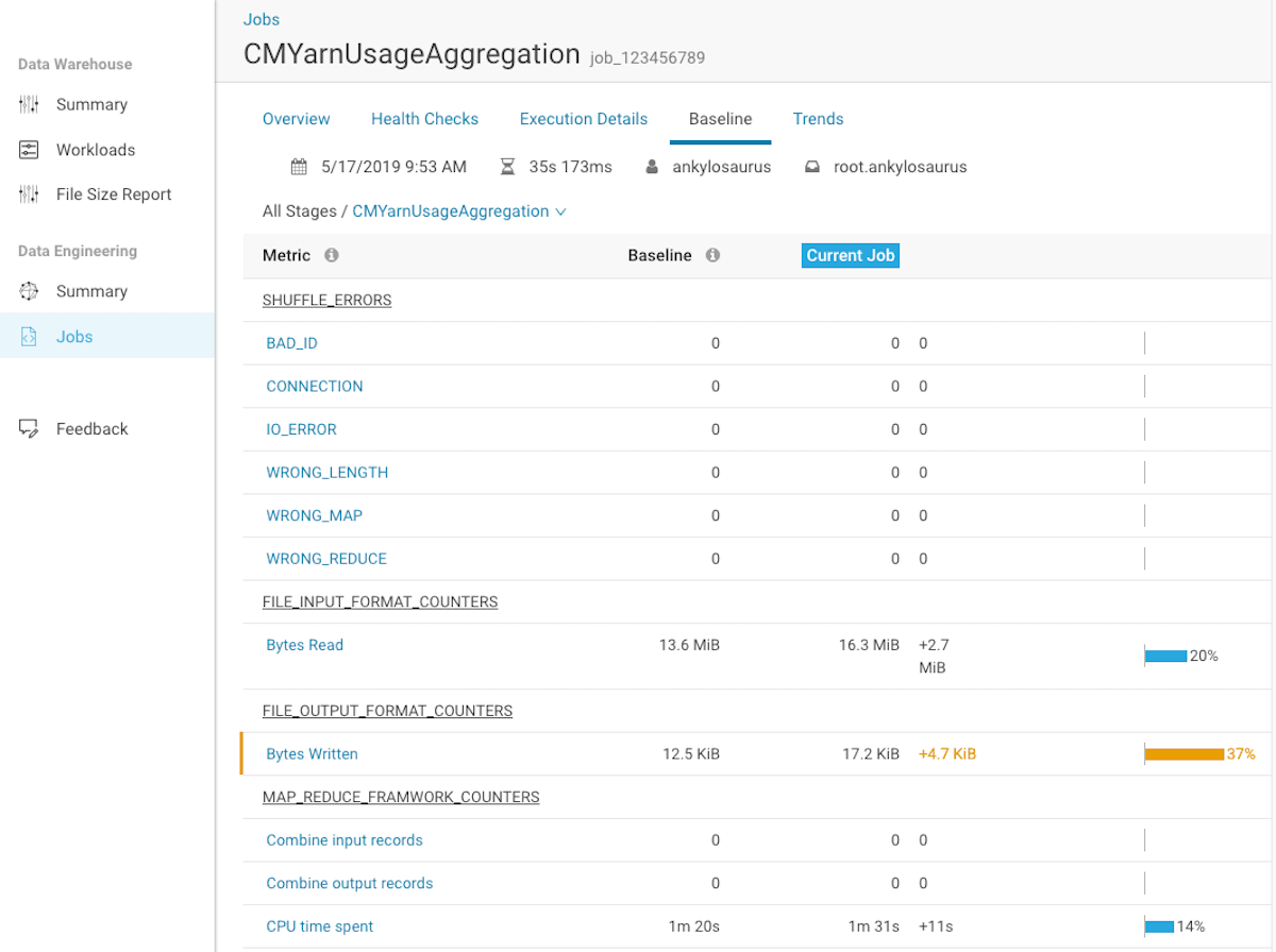 Describes the Baseline metric feature of the Data Engineering Jobs page.