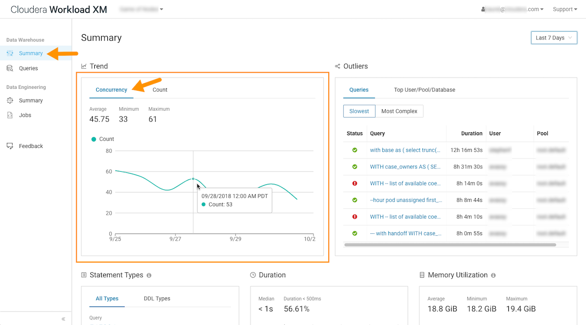 - The Concurrency chart in the Data Warehouse Summary page,