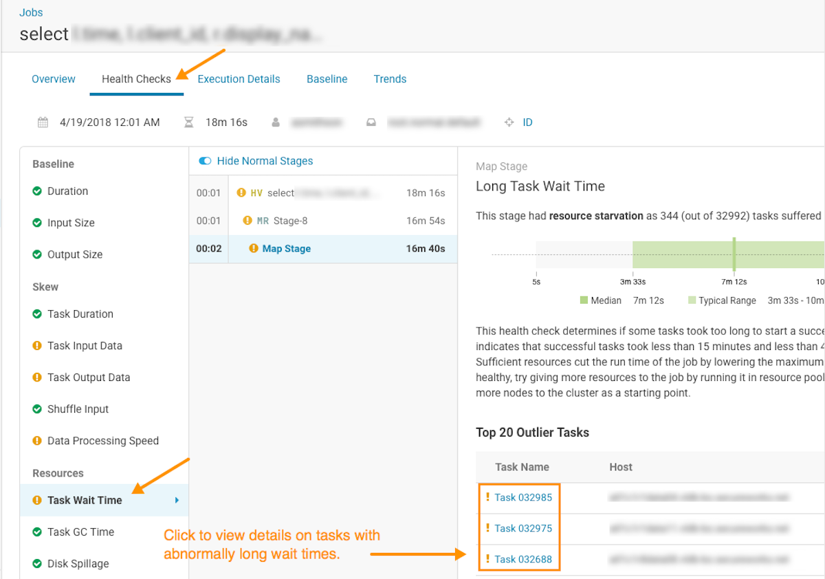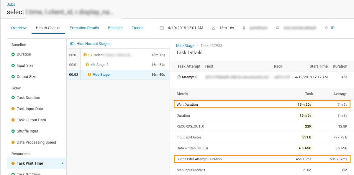 In the following example, the Task Details show that the task's wait time is above average. When comparing the Wait Duration value with the Successful Attempt Duration value, the task when it does finish has a significantly better than average time. This indicates that insufficient resources are allocated for this job.