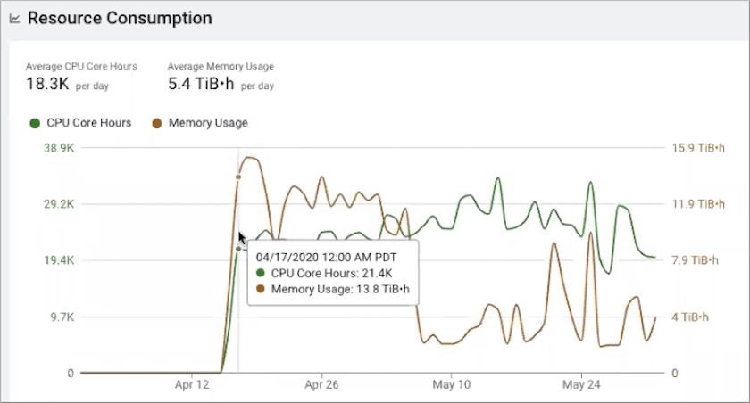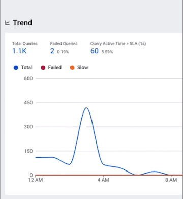 Location: This chart widget is found on the Jobs or Query's page, which is accessed by selecting the workload cluster for analysis and then from the navigation side-bar, selecting the engine of interest. Depending on the engine chosen, from the Trends chart widget, click Total Jobs or Total Queries and then from the Jobs or Queries page, select the job or query of interest and then select the Trends tab.